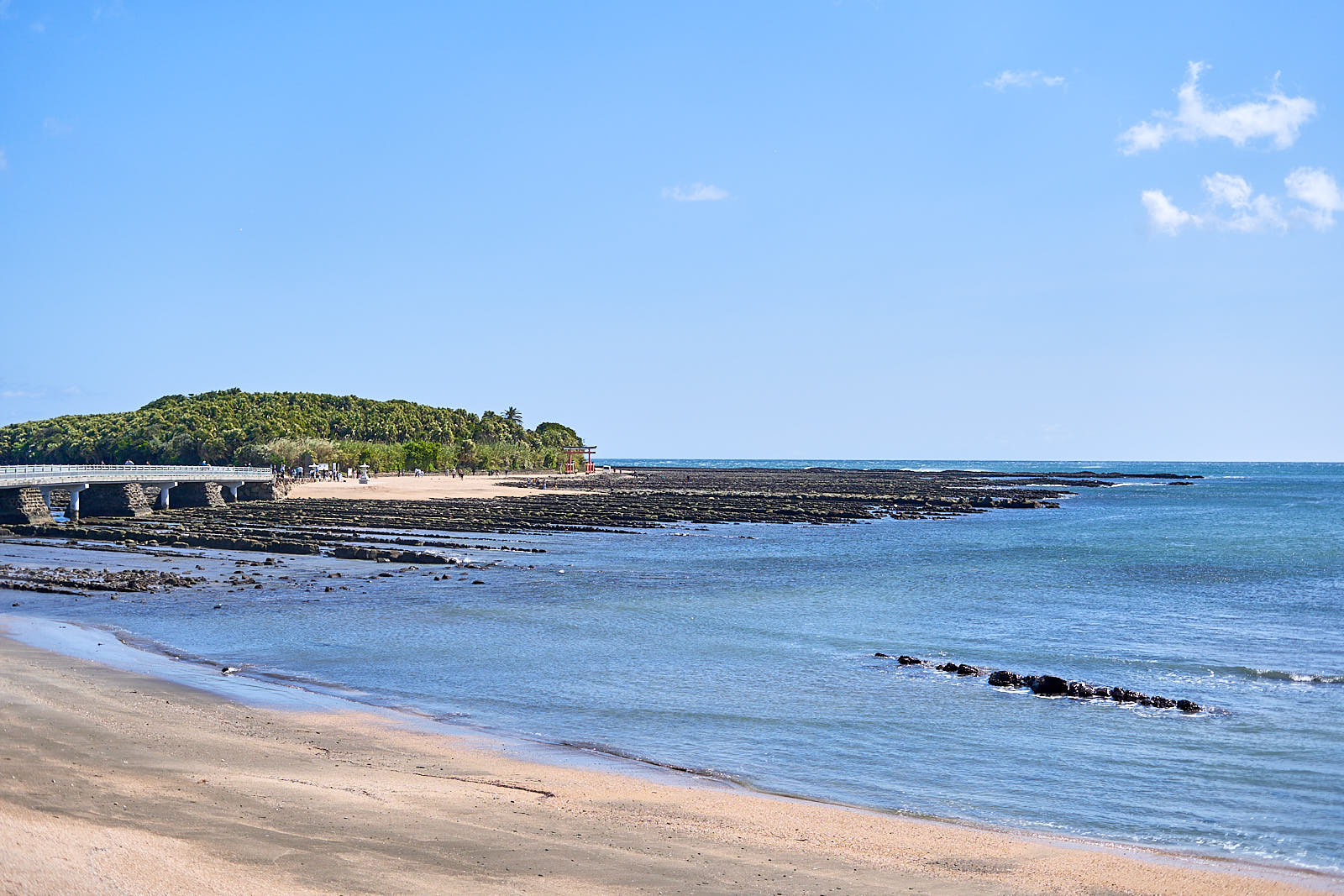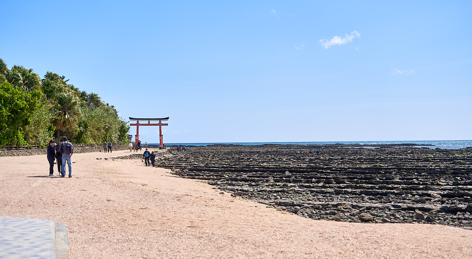 Aoshima sala pasirodė išties įdomi – aplink ją beveik linijomis iškilęs akmenų takas. Gal tiksliau, daug takų, vieno šalia kito, bet gražiai susijungusių. Nebuvau dar matęs nieko panašaus kitur. O šarmo dar pridėjo beveik uraganinis vėjas, kartais verčiantis iš kojų. Visai nenustebau saloje radęs tarp medžių pasislėpusią šventyklą. Tarsi maža rami oazė, apsupta palmių ir kitokių subtropinių augalų. Jei ne Japoniška šinto šventykla būčiau pasijutęs kaip kokiuose Maldyvuose. Iš pradžių dar galvojau, gal visą salą apeiti, bet dėl to didelio vėjo ir tako nebuvimo šios minties atsisakiau. Kaip ir pasivaikščiojimo taku šalia paplūdimio. Užteko vieno karto, kai net sustoti ir užsimerkti turėjau, kad smėlio į akis neprikristų. Bet ko neatsisakiau – tai pasivaikščiojimo visai šalia esančiame nedideliame botanikos sode.
