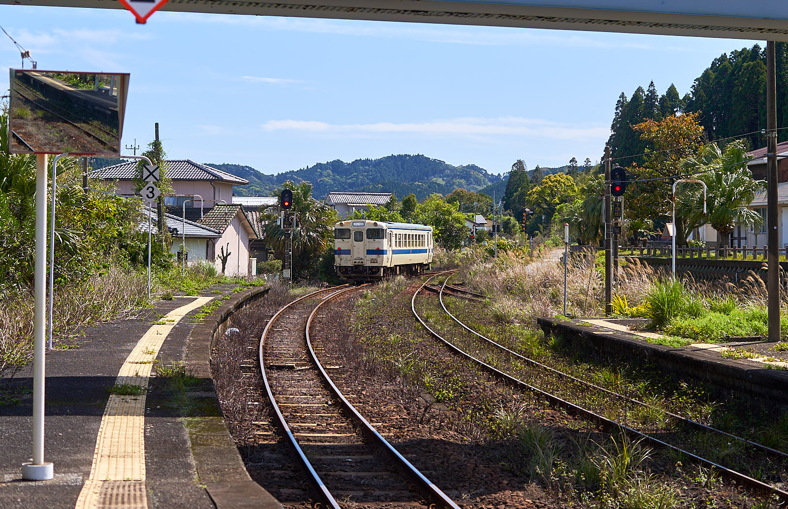 Taip viską apėjęs grįžti nusprendžiau traukiniu. Bet mano didžiam nustebimui sekantis turėjo atvažiuoti tik po maždaug pusantros valandos. Panašiai ir su autobusais – atrodo jie čia važinėja išties retai. Tad turėdamas laiko pavalgiau naminio kario su ryžiais (gal truputį skaniau nei gamyklinis, bet didelio skirtumo nepajaučiau), ir mėgavausi ramuma šalia esančioje stotyje. Jaučiausi kaip kaime, kai vaikystėje karštą vasaros dieną kur nors sau ilsėdavausi besimėgaudamas gamtos garsais. O atvažiavus senam dyzeliniui vieno vagono traukiniui pamačiau, kad ten net linija neelektrifikuota. Visiškas kaimas. Nors pačiame Myazaki mieste gyvena apie 410 000 gyventojų.