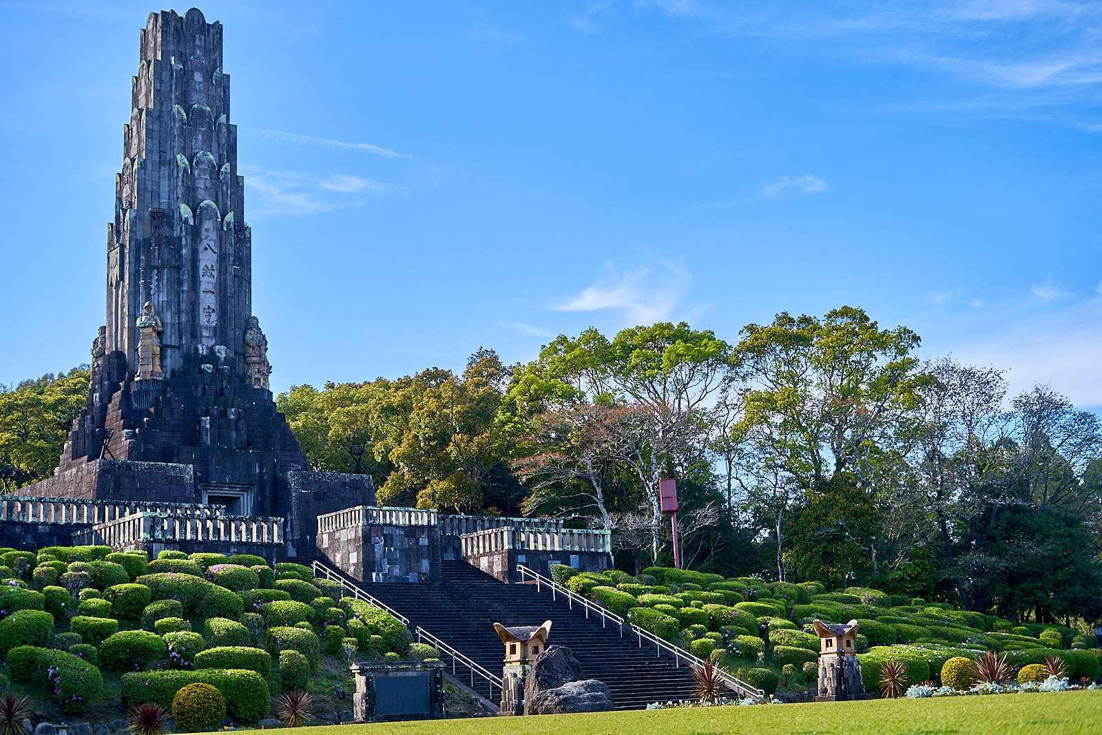 Toliau nusprendžiau aplankyti kitame miesto gale esantį parką. Ir jau buvau beveik atsisakęs šios minties, bet baisiai vėluodamas atvažiavo reikiamas autobusas. Išties džiaugiausi, kad čia, kitaip nei Kagoshimoje, autobusuose veikė mano Fukuokoje įsigyta viešojo transporto kortelė. Pats parkas pasirodė daugiau kaip takų rinkinys kalnuose su šen bei ten esančiu įdomesniu objektu. Vienas iš jų – toks tarsi senovinis obeliskas. Labai primenantis objektą iš kokių majų laikų, ar senovinės šventyklos Meksikoje. Dar norėjau aplankyti apžvalgos aikštelę, bet dėl neaiškaus žemėlapio ir sparčiai artėjančios tamsos, teko pasitenkinti pro plyšius besimatančia miesto panorama iš šiek tiek aukštesnės vietos. Ir dar minties, kad iš šio krašto reikia grįžti kuo greičiau, nes susidarė įspūdis, kad autobusai skirti tik pensininkams ir važiuoja tik dienos metu. Bet galėjau taip labai ir neskubėti. Nors vėlgi, einant link tos aikštelės, net nežinau ar geru keliu, žmonių jau nebebuvo.