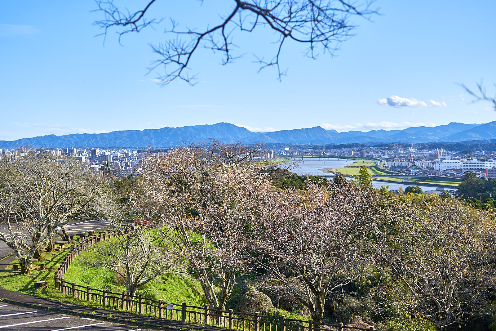 Miestas iš šiek tiek aukščiau. Su jau beveik pražydusiomis sakuromis.