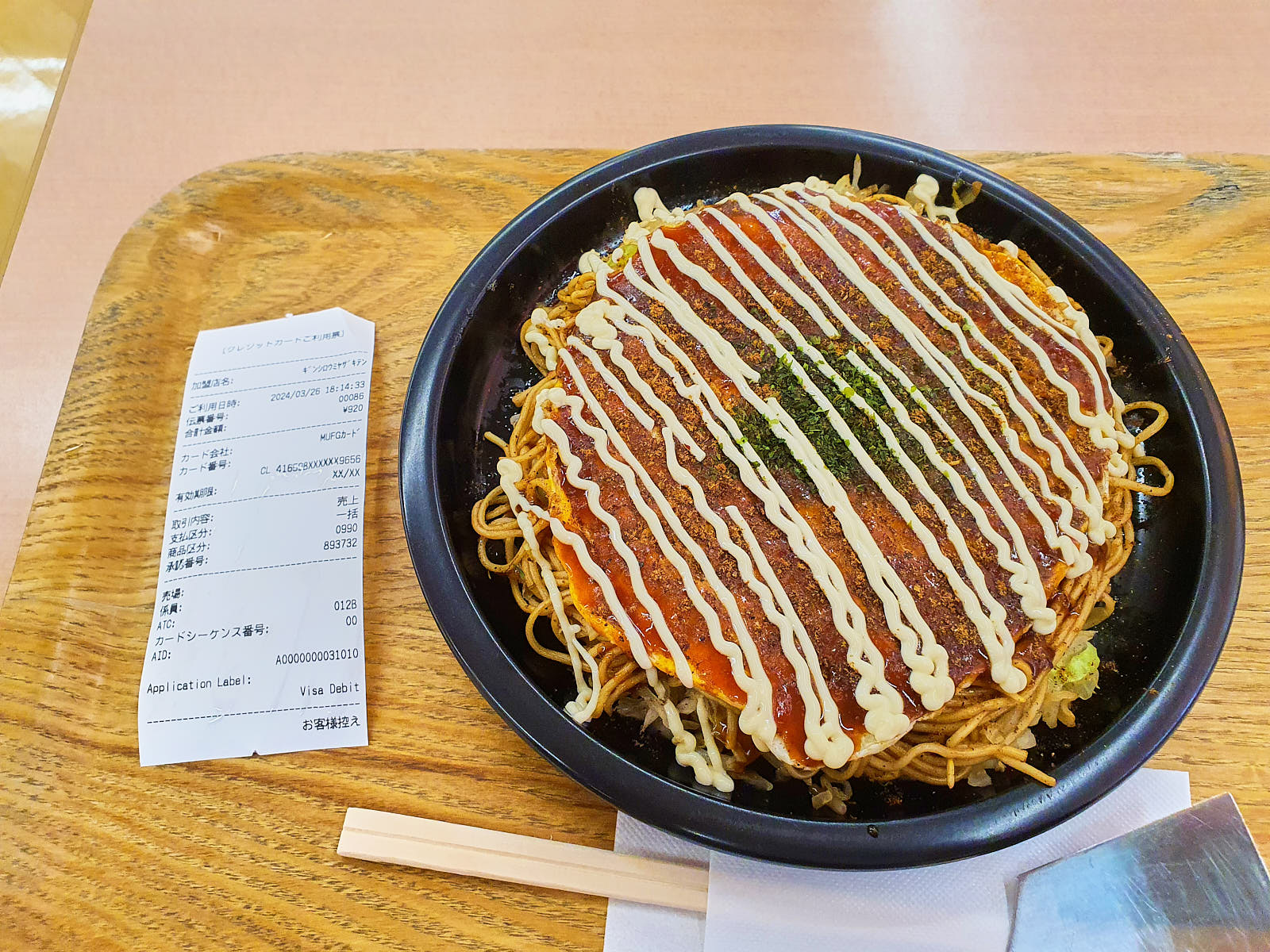 Žinodamas, kad ryte neturėsiu laiko, prieš grįždamas užsukau į vietinį prekybos centrą pasiimti maisto pusryčiams. Apsidžiaugiau ten radęs dar veikiantį Okonomiyaki restoraną. Tiksliau užkandinę, o ne restoraną. Ir po to nuolaidų maisto produktams. O grįždamas autobusu sužinojau, kad kaina iki oro uosto beveik tokia pati kaip ir traukiniu, apie 300 jenų.